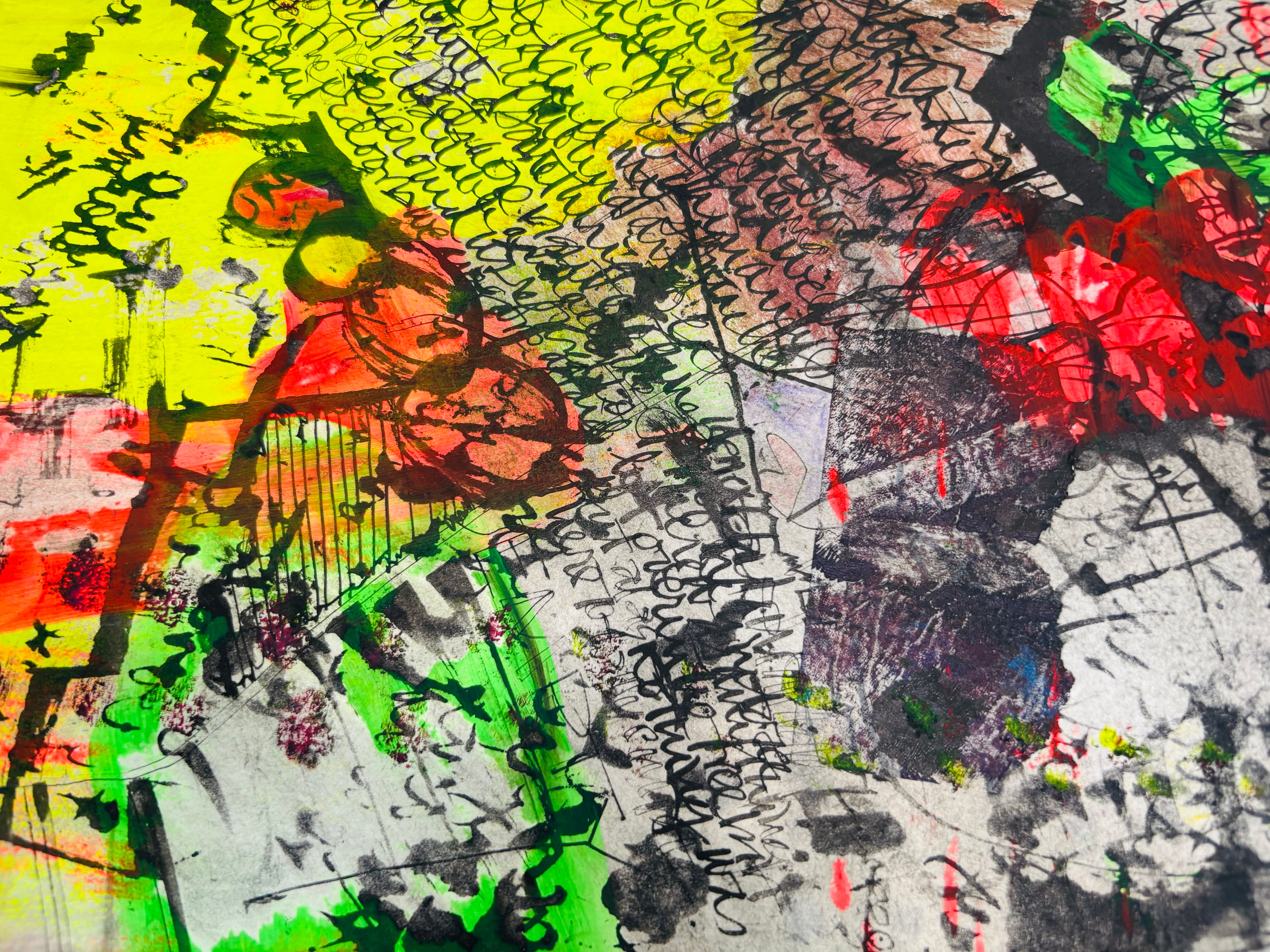 A Walk About with a Dip Pen This moment . . . I rode these marks In waves of rollicking fun Twists & turns No form, no fancy. That moment . . . I’m in the tangle. In the torn. All the bits & pieces so stark, unadorned. Edging closer. Hemming in. Pushing on All a-tangle. A Pause . . . Here. Hear. A subtle heartbeat, A sure and bated breath. A harmony of riffs, “There. There,” she says, like the sprouting of a seedling. Quiet rest assured. “We can do this together.” Note: On an ordinary day of ups and downs, there are moments I just can’t manage to enter A Pause . . . My Art: a dip pen, carbon black ink, acrylic fluorescent paints, collage created on a Gelli plate, and scripting (my personal word flow intended to be indecipherable)